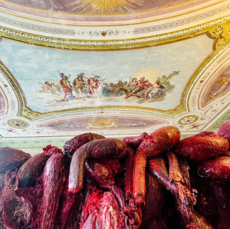 One of the most striking works in the exhibition is the Symphony for the Beloved Sun, which features a large conveyor belt that transports pieces of "meat" to a red sun. It's a whimsical and metaphorical representation of the cycles of life and death and the passage of time.